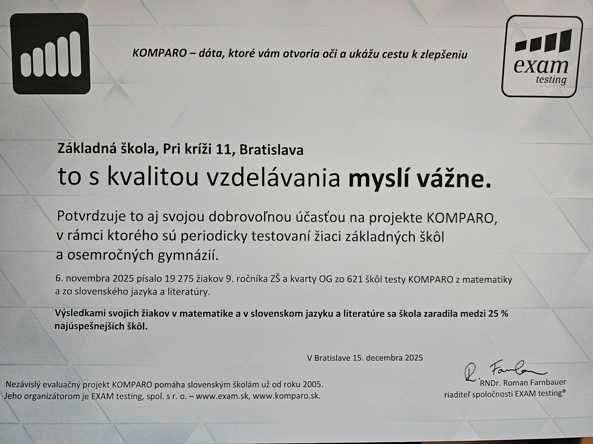 Žiaci ZŠ Pri kríži sa na základe svojej vysokej dobrovoľnej účasti a krásnym výsledkom v testovaní Komparo zaradili medzi 25% najúspešnejších škôl naprieč Slovenskom, čo svedčí o vysokej motivácii žiakov uspieť na blížiacich sa prijímačkách a v Testovaní 9, ktoré ich čakajú v druhom polroku škol. roka 2025/2026.