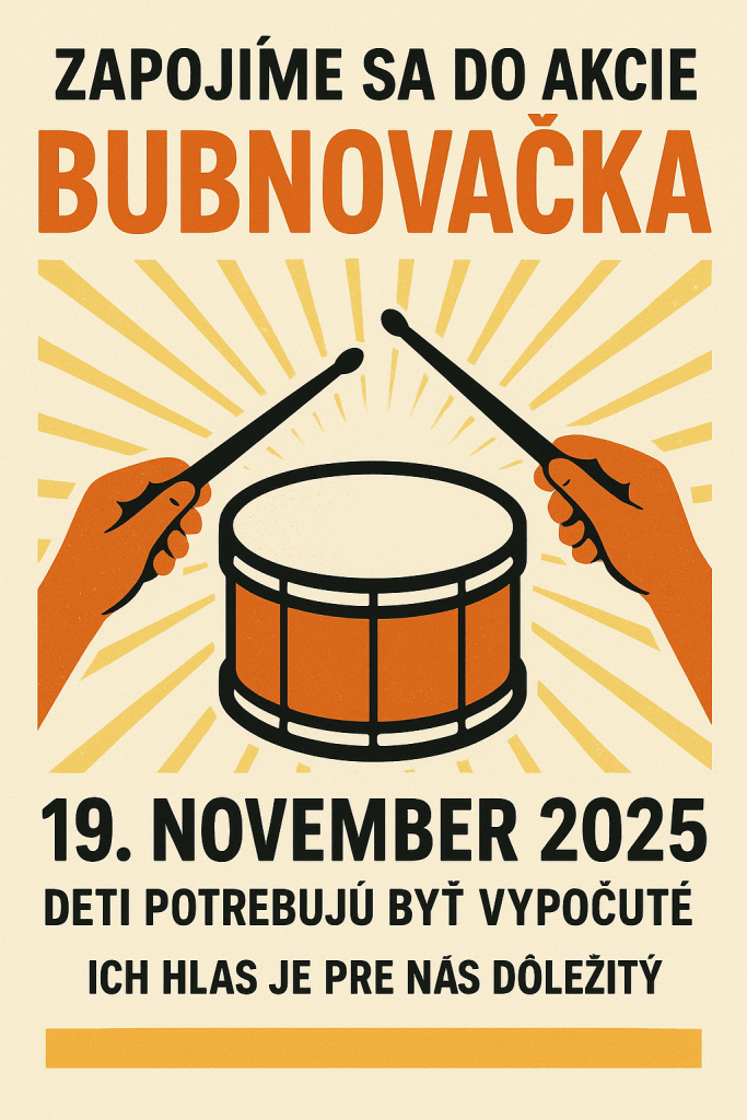 Naša škola sa dňa 19.11.2025 medzi 10.00 – 11.00 zapojí do podujatia Bubnovačka. Cieľom podujatia je symbolicky „zabubnovať“ do sveta, že deti potrebujú byť vypočuté – že ich hlas, pocity a potreby sú dôležité.
